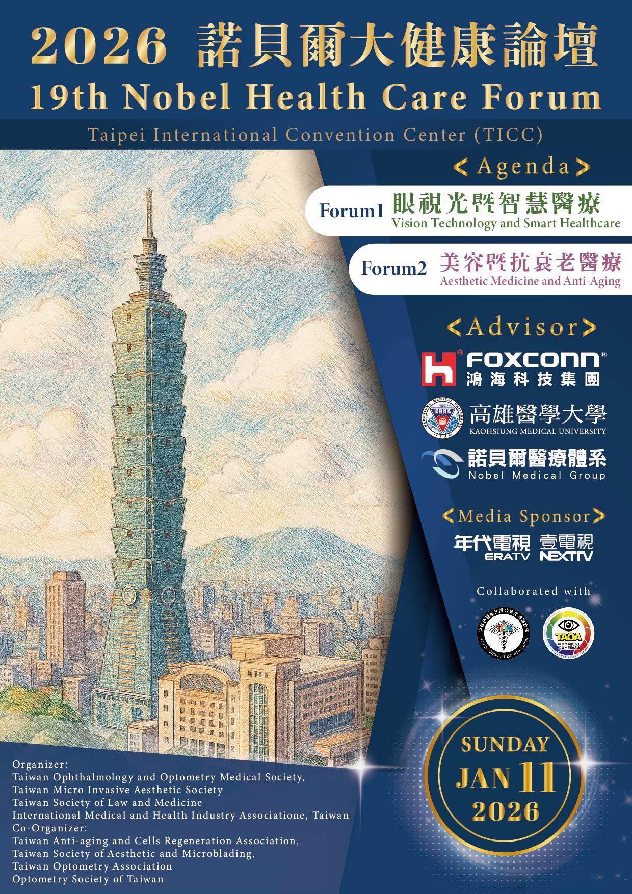 諾貝爾醫療體系 很榮幸邀請 鴻海科技集團、高雄醫學大學及相關醫事團體共同於 2026 年 1 月 11 日(星期日)假 台北國際會議中心 (TICC )隆重舉辦 「2026 第十九屆諾貝爾大健康論壇」。